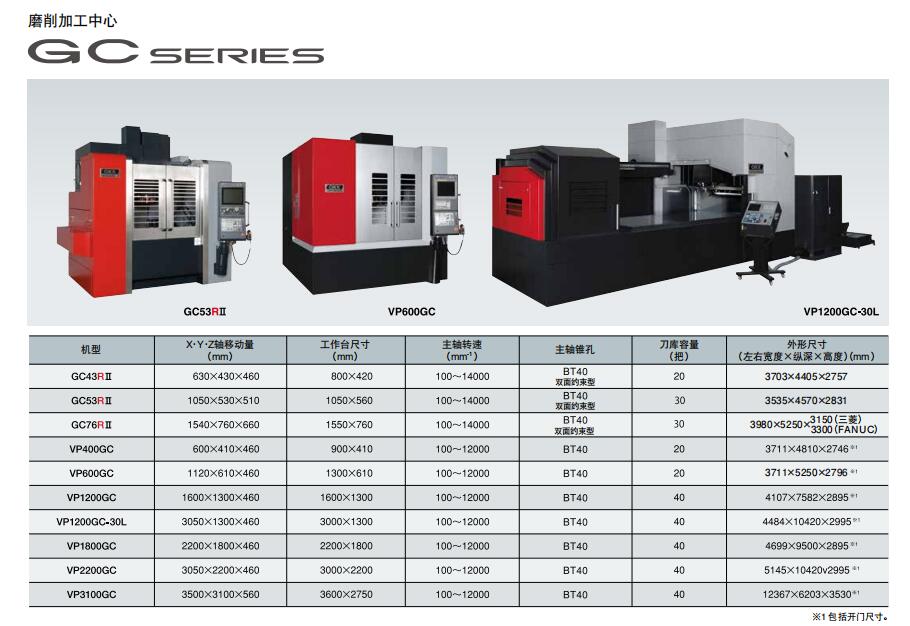 • · GC53RII可加工多種材料,效率高、精度高。此外,通過自動磨石刀具交換裝置和NC功能,該模型促進了磨削過程的自動化。